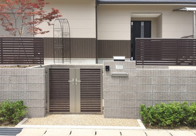 ユニソン「ジャスティ」による統一感のある土留めが、邸宅の土台を凛と際立たせています。その上部を囲うLIXIL「ジオーナフェンスB3型」の細身な横ボーダーは、プライバシーを守りながらも木目調の温かみで圧迫感を与えません。また、セットバックの空地にはサツキを植え、緑のベルトが街並みに優しく溶け込む、環境にも配慮した美しい佇まいを実現しました。