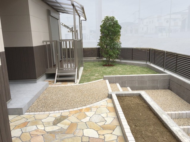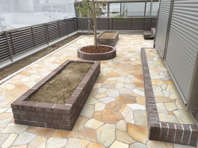 お庭の主役を飾るのは、天然石の豊かな表情が際立つ『カレイドストーン』の石張りです。その大胆な石の重厚感に対し、花壇には温かみのある風合いのユニソン『カルタブリック』をセレクト。計算された素材の対比が空間に心地よいメリハリを生み出し、ナチュラルな優しさと都会的な洗練が同居する、格調高いプライベートガーデンを創り上げました。