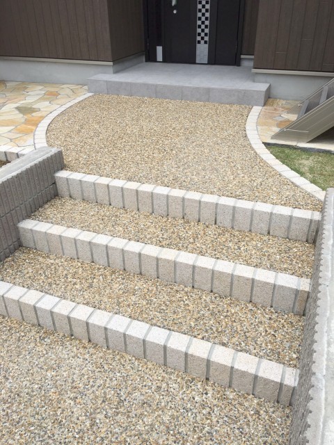 「ゆとりを生む折り返し階段。ピンコロ石と洗い出しが奏でる、優しいお迎え」