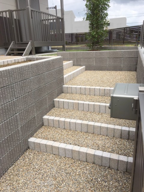 門柱から玄関へと直進するのではなく、あえて折り返しを設けることで、ゆったりと歩みを進められるアプローチ動線を確保しました。階段の立ち上がりには自然石の風合いが豊かなピンコロ石を、踏み面には柔らかな質感の洗い出しを採用。素材の持つ優しい風合いが、一段ごとに住む人の心を解きほぐし、穏やかな帰宅のひとときを演出します。