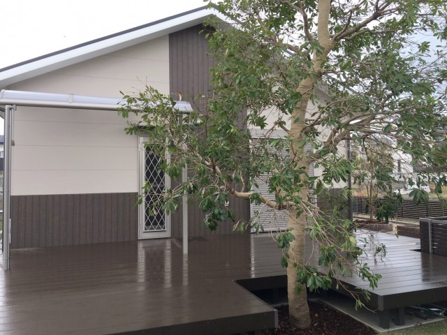 LIXILの人工木樹脂ウッドデッキの「樹ら楽ステージ」を大胆に配置し、ヤマモモの木がデッキの中央から顔を出す、まるでカフェのような開放感ある空間を創り出しました。二方向に設けた階段は、お庭のどこにいてもデッキへと誘う回遊性を生み出しています。お庭の石張りとデッキの木質感が美しく調和し、住まい全体に広がりと落ち着きをもたらしました。