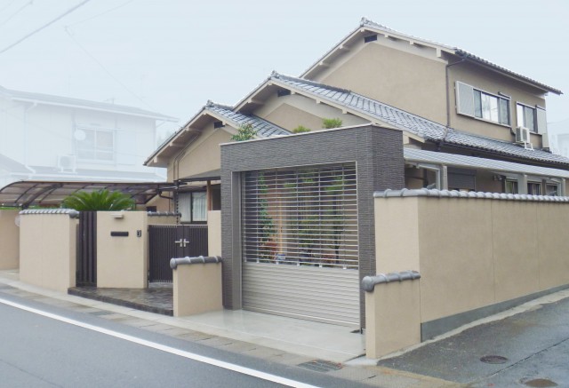 かつての和風庭園を大胆にリノベーションし、使い勝手の良さを追求した都市型ファサードを再構築しました。セキュリティを高める『シングルシャッターCタイプ』を軸に、タイル仕上げの細割ボーダーが描き出す幾何学的なラインが、落ち着きある和の質感を演出。伝統的な『和』の要素を、現代的な機能美として昇華させた提案です。