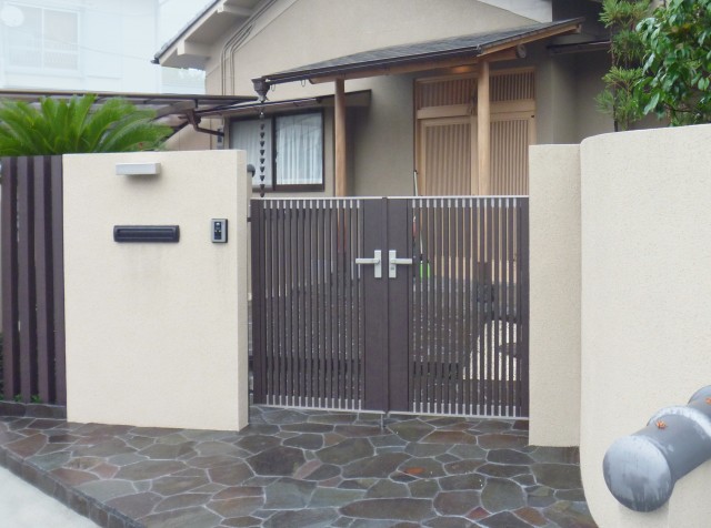 「鉄平石が描く重厚な迎え。柿渋とステンレスが織りなす、洗練の和モダン・ゲート」